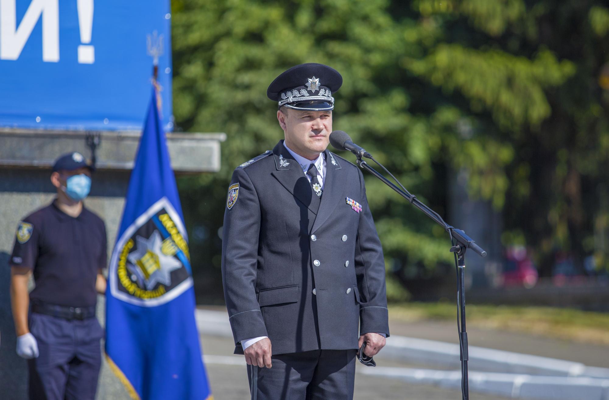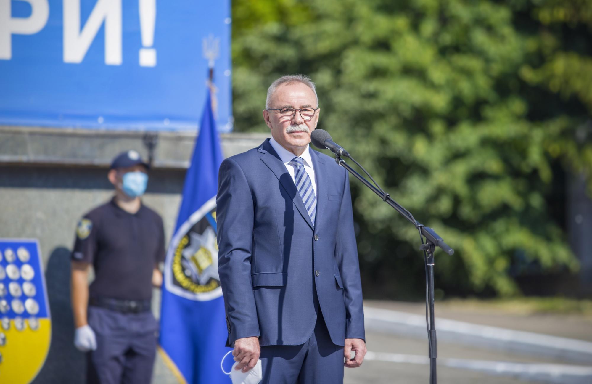 Председатель Нацполиции Игорь Клименко поздравил присутствующих с пятой годовщиной создания Национальной полиции Украины и отметил, что праздник приходится отмечать в ограниченном формате из-за карантина и полицейские первые, кто должны их придерживаться.