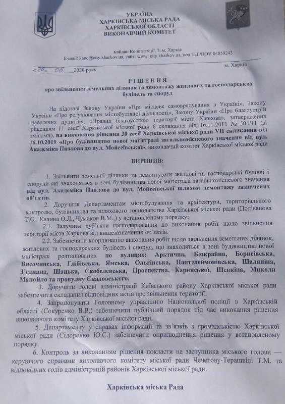 Исполнительный комитет Харьковского городского совет не принимал решения о демонтаже жилых домов и хозяйственных построек в зоне строительство новой магистрали через рынок «Барабашово».