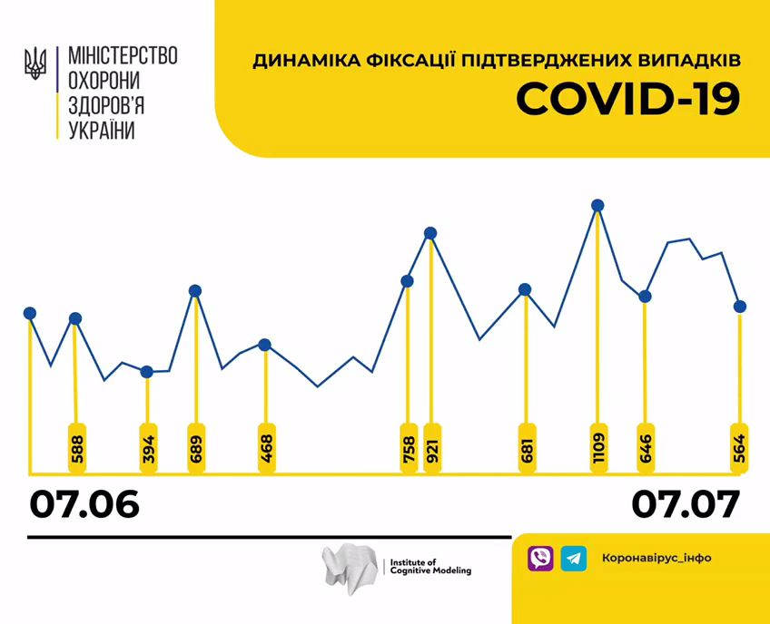 7 июля (по состоянию на 9:00) в Украине 49607 (+564 за сутки) лабораторно подтвержденных случаев COVID-19, из них 1283 летальных, 22193 пациенты выздоровели. За сутки зафиксировано 564 новых случая.