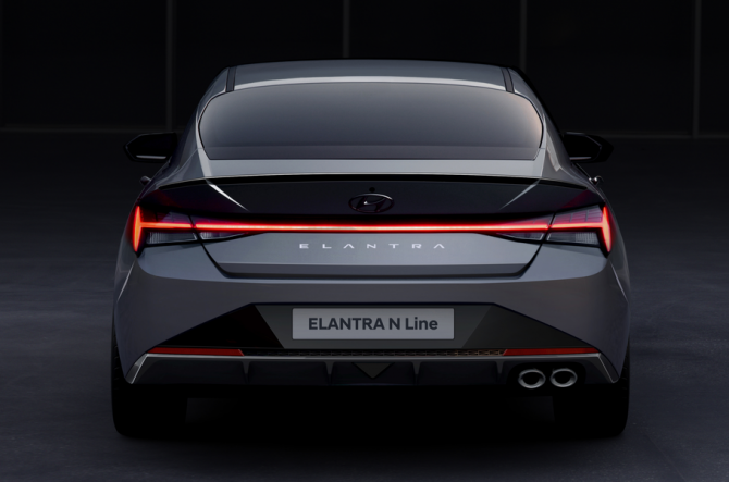 В Hyundai отметили, что Elantra N Line будет отличаться от обычной версии этого седана новыми бамперами измененного дизайна, новой широкой решеткой радиатора, большим воздухозаборником и оригинальными 18-дюймовыми легкосплавными дисками. Видны также спойлер на крышке багажника и сдвоенные патрубки выхлопной системы.