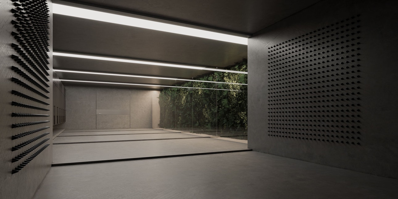 В проекте создана большая спортивная зона: бассейн, похожий на ночное море, зона велотренажеров в стиле диско-зала, классический спортзал и комната для медитаций. В центре нее — мощный световой луч, который позволяет менять сценарии на потолке. Это может быть звездное небо, моросящий дождь или восход солнца.