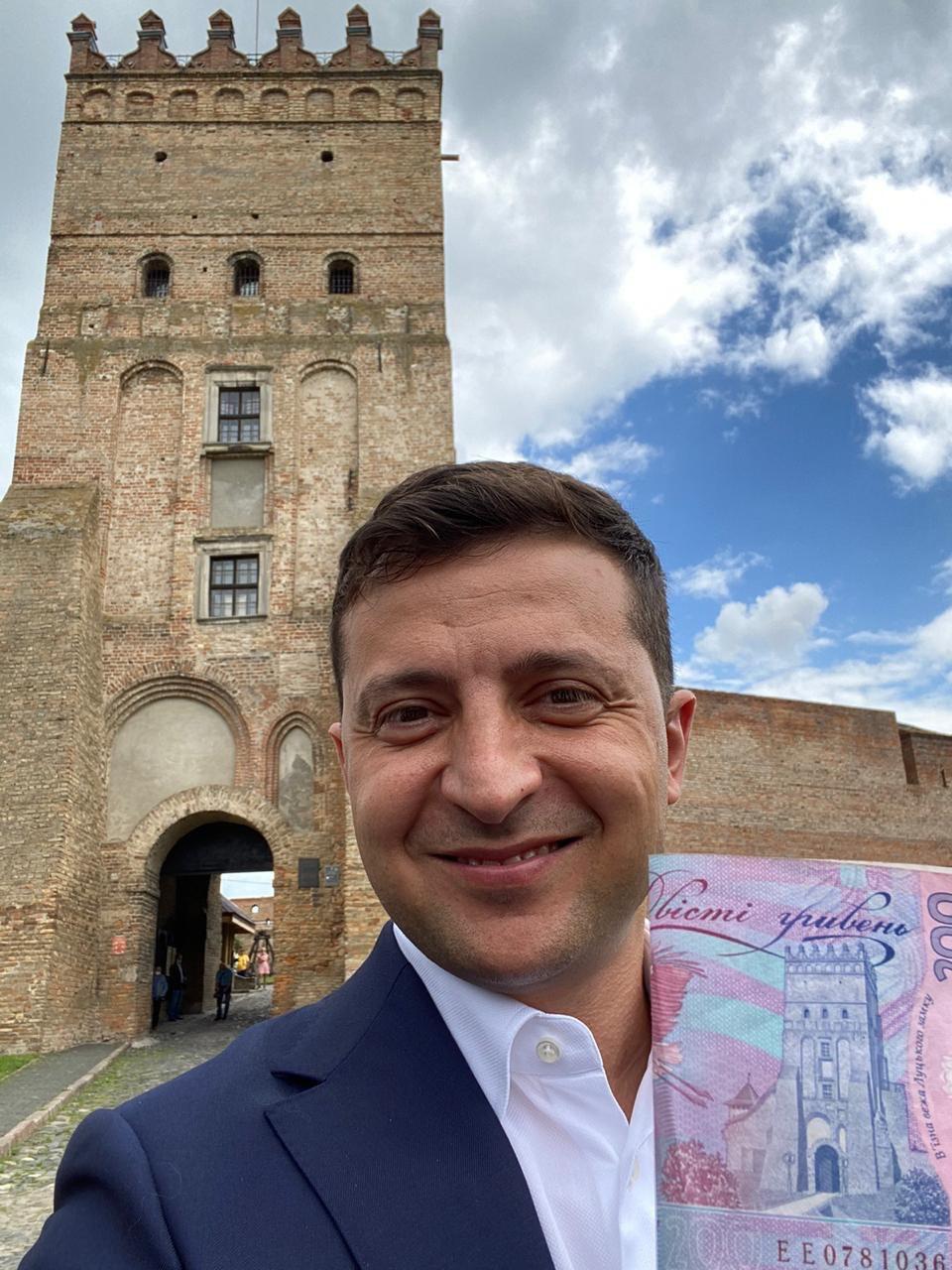 "Похоже? Позади меня - въездная башня Луцкого замка, та самая, что на нашей 200-гривневой купюре. Всегда мечтал сравнить рисунок с реальностью. В замке почувствовал дух истории и волынских легенд", - прокомментировал Зеленский свое селфи в социальных сетях.