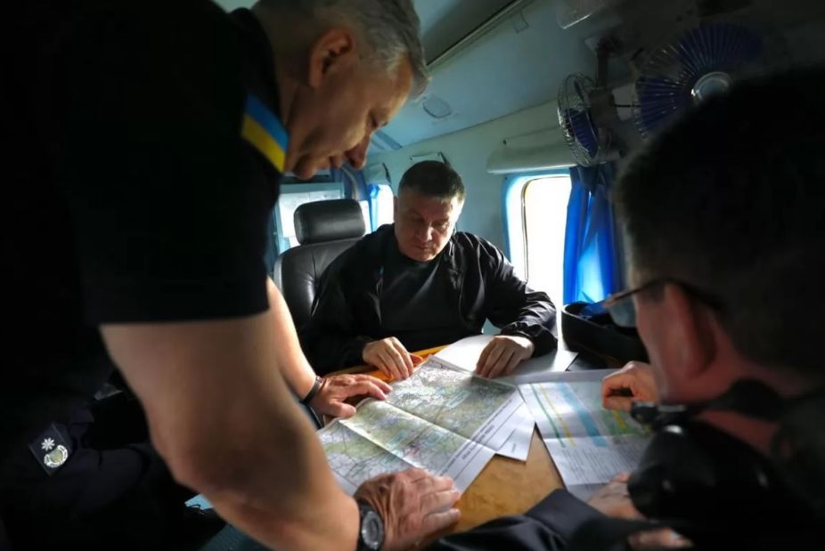 "Утром с секретарем СНБО, главами ГосЧС, Нацполиции Украины работаем на месте лесных пожаров вблизи Северодонецка в оперативном штабе, совершили воздушный мониторинг районов возгорания", - сообщил Аваков.