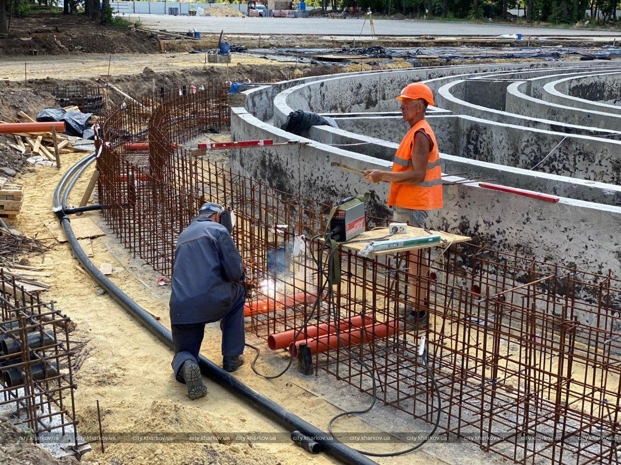 По его словам, сейчас там завершается строительство каркаса фонтана: рабочие заливают последнее бетонное кольцо конструкции.