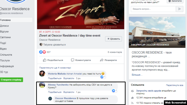На вопросы о том, не запретят ли российской певице въезд в Украину в связи с тем, что она выступала на аннексированном полуострове, организаторы OSOCOR RESIDENCE отметили, что она уже приезжала выступать в прошлом году.