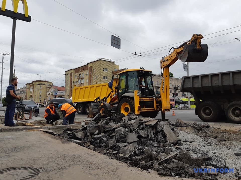В центре Запорожья из-за сильного дождя произошло проседание асфальта, на аварийном участке перекрыли движение транспорта и в срочном порядке укладывают новое дорожное покрытие.