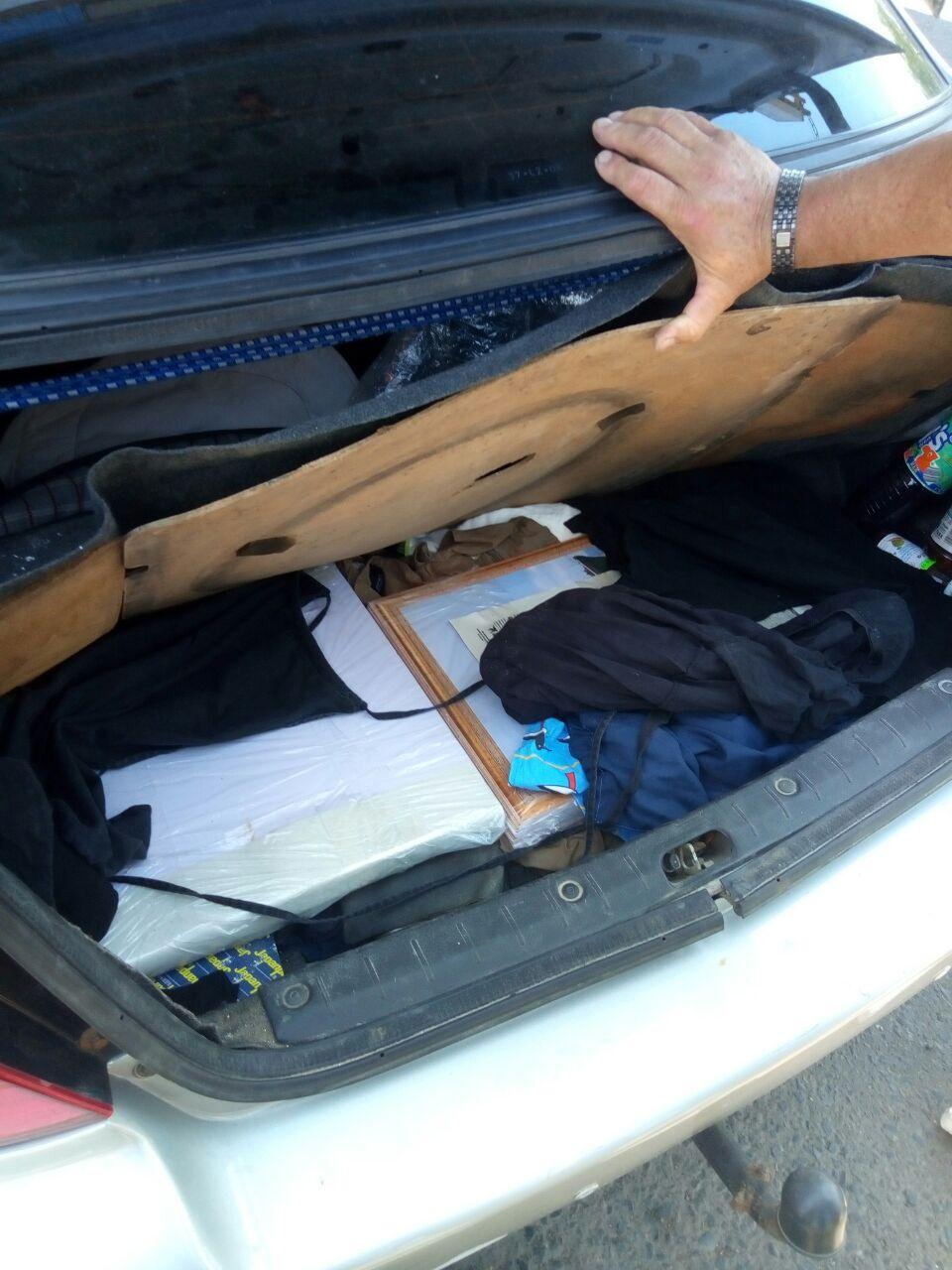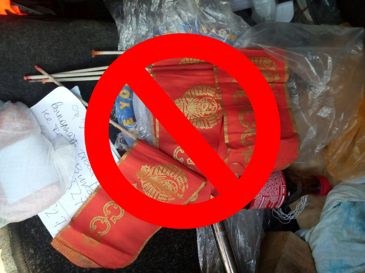 Погранично-таможенная группа обнаружила в багажнике флаги с символикой СССР, с гербом РФ, картины с символикой РФ, картины с изображением президента РФ, картины с изображениями военной техники страны-агрессора, наклейки, награды, а также значительную сумму средств в иностранной валюте.