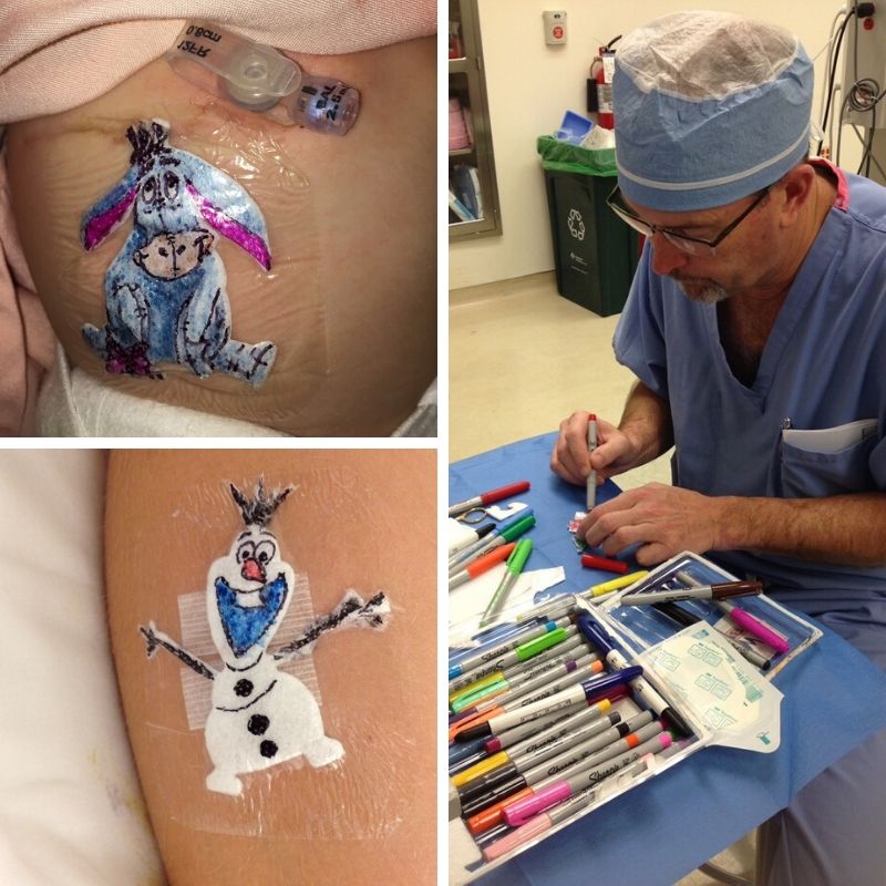 Когда врач Роберт Пари откладывает скальпель, то берётся за цветные ручки. Он рисует хирургические повязки для своих маленьких пациентов. По словам хирурга, он это делает, чтобы дети запоминали шрам после операции.