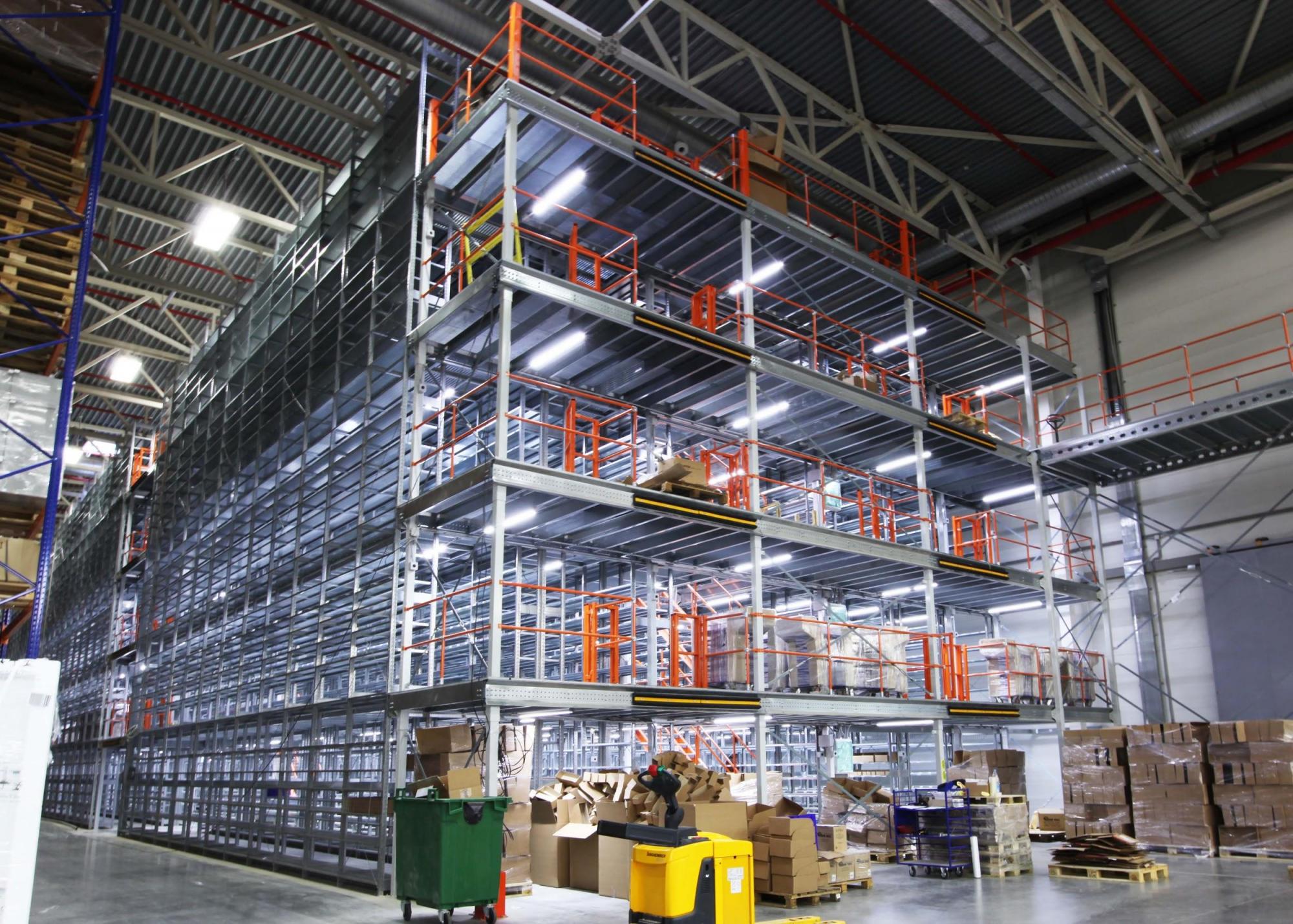 А что делать, если площадь помещения невелика, зато высота потолка позволяет использовать пространство вертикально? Логичное решение проблемы - оборудовать перекрытие вроде второго этажа, чтобы персонал мог подниматься на второй ярус за товаром без стремянки. Такие складские стеллажи Украина стала производить относительно недавно. Они получили название мезонинные.