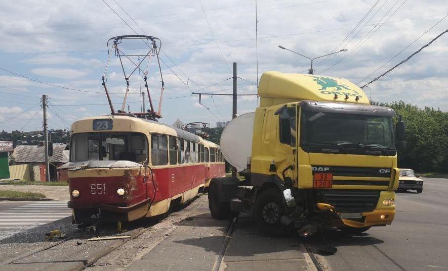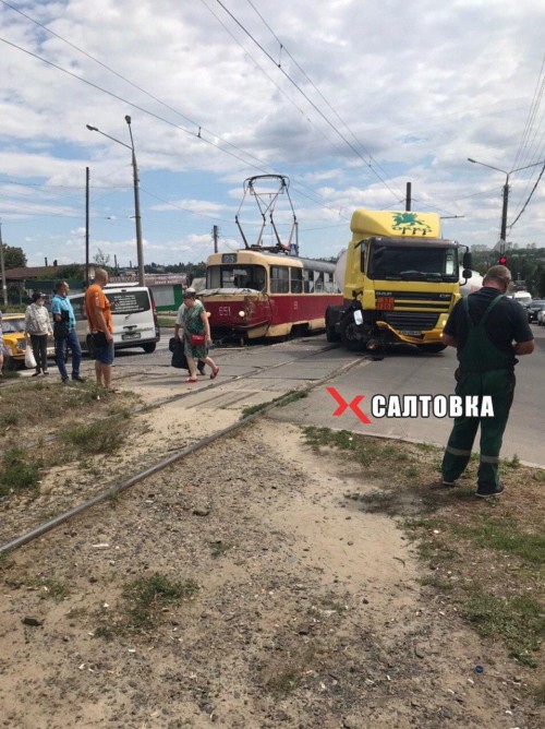 Сегодня около 14:00 на пересечении проспекта Тракторостроителей с улицей Краснодарской столкнулись трамвай 23 маршрута и бензовоз DAF.