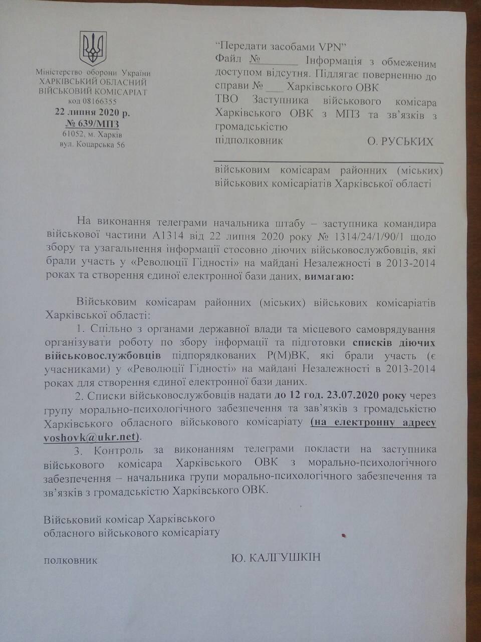 Соотвтетствующее письмо за подписью военкома Харьковщины, а так же свою - особую - точку зрения на него на своей странице в соцсети опубликовала нардеп от Европейской солидарности Ирина Фриз.