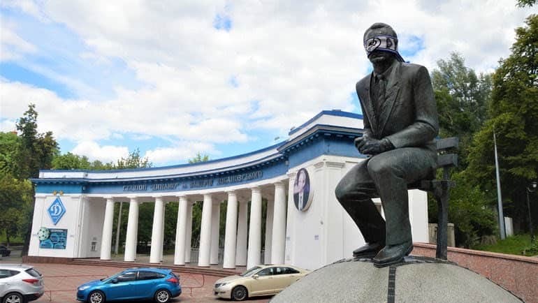 Ко всему прочему, сегодня памятнику Валерия Лобановского, что расположен, у центрального входа на стадион ФК завязали глаза.