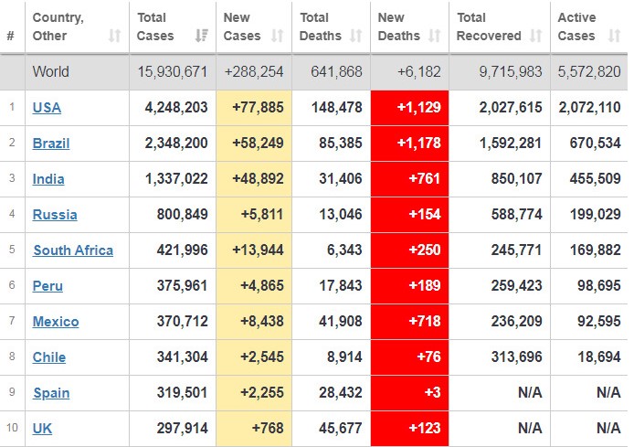 В США за минувшие сутки диагностировали 77 885 случаев коронавируса, в Бразилии 58 249, в Индии 48 892, ЮАР 13 944, Мексика 8438 и другие. Новые случаи заболевания обнаружили в 170 странах мира.