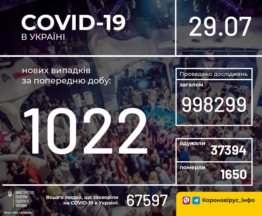 29 июля (по состоянию на 9:00) в Украине 67597 лабораторно подтвержденных случаев COVID-19, из них 1650 летальных, 37394 пациента выздоровели. Об этом сообщает Центр общественного здоровья.