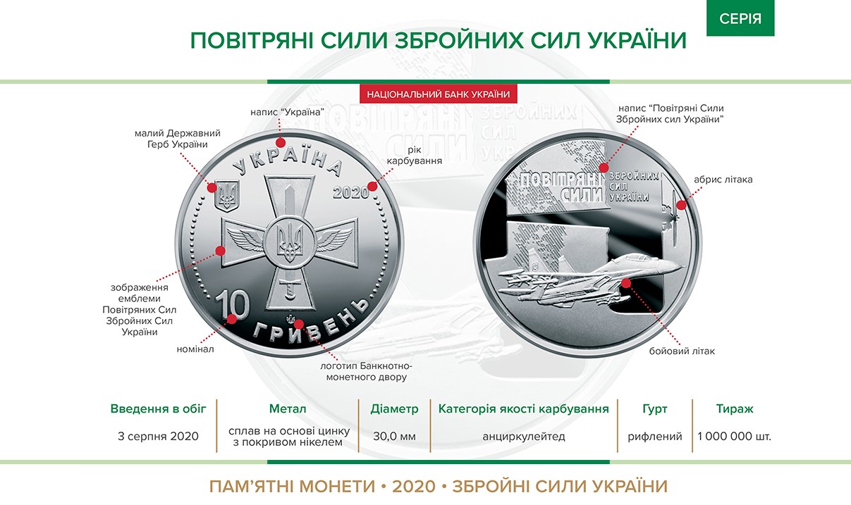 Национальный банк Украины выпускает памятную монету "Воздушные Силы Вооруженных Сил Украины" номиналом 10 гривен.