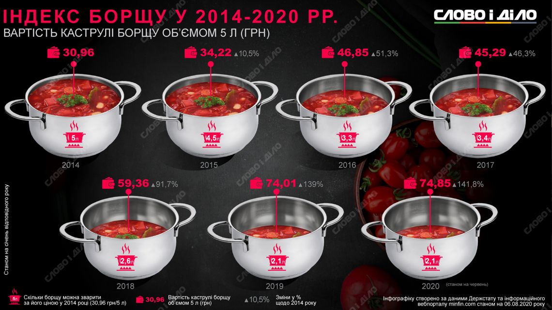 В 2014 году стоимость пятилитровой кастрюли борща составляла 30,96 грн. В следующем году подорожали практически все ингредиенты, и кастрюля борща стоила уже 34,22 грн (+10,5%). В цене выросли свинина, свекла, капуста, масло и сметана. В 2016 году пять литров борща уже стоили 46,85 грн (+36,9%).
