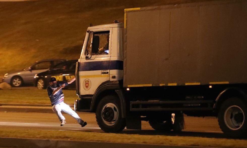 В ночь на 10 августа в Минске группа протестующих попыталась перекрыть путь автозаку. Один из них зацепился за бампер автомобиля, проехал на нем несколько метров, а потом упал под колёса.