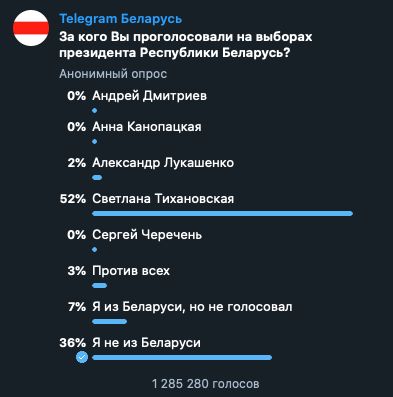 Позже канал запустил опрос с названием «За кого Вы проголосовали на выборах президента Республики Беларусь?» Выбрать вариант с кандидатом могли только пользователи с белорусскими сим-картами.