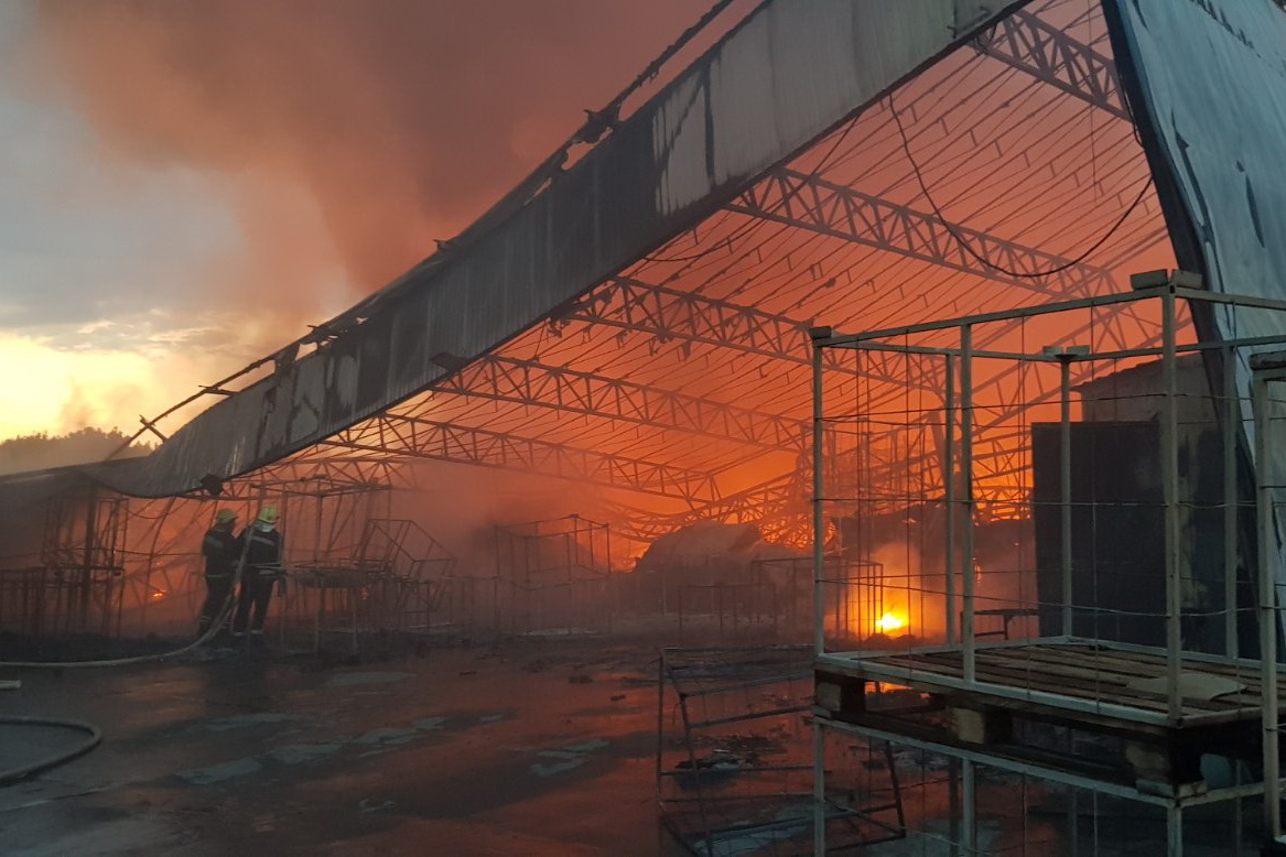 "К месту вызова было направлено 8 отделений пожарно-спасательной службы на автоцистернах. На момент прибытия спасателей было установлено, что огнем было охвачено складское здание с готовой продукцией с резины на площади около 1000 кв. м", - говорится в сообщении.