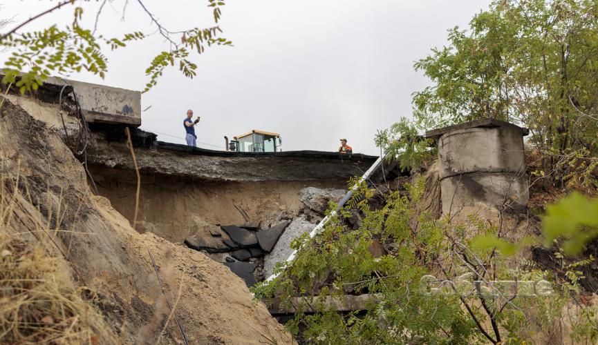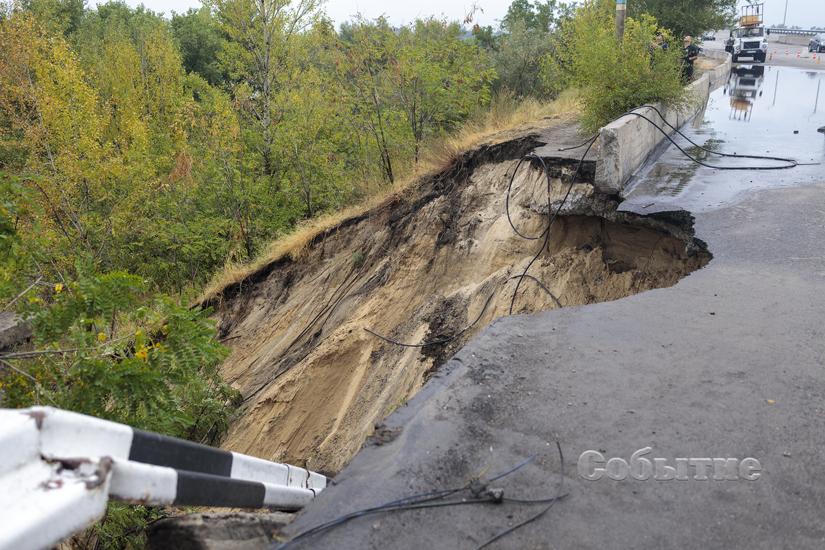 Часть мостового перехода, включающая в себя дорожку для пешеходов, дорожное полотно с ограждением и столбом – рухнула. Куски моста сползли вниз по насыпи.