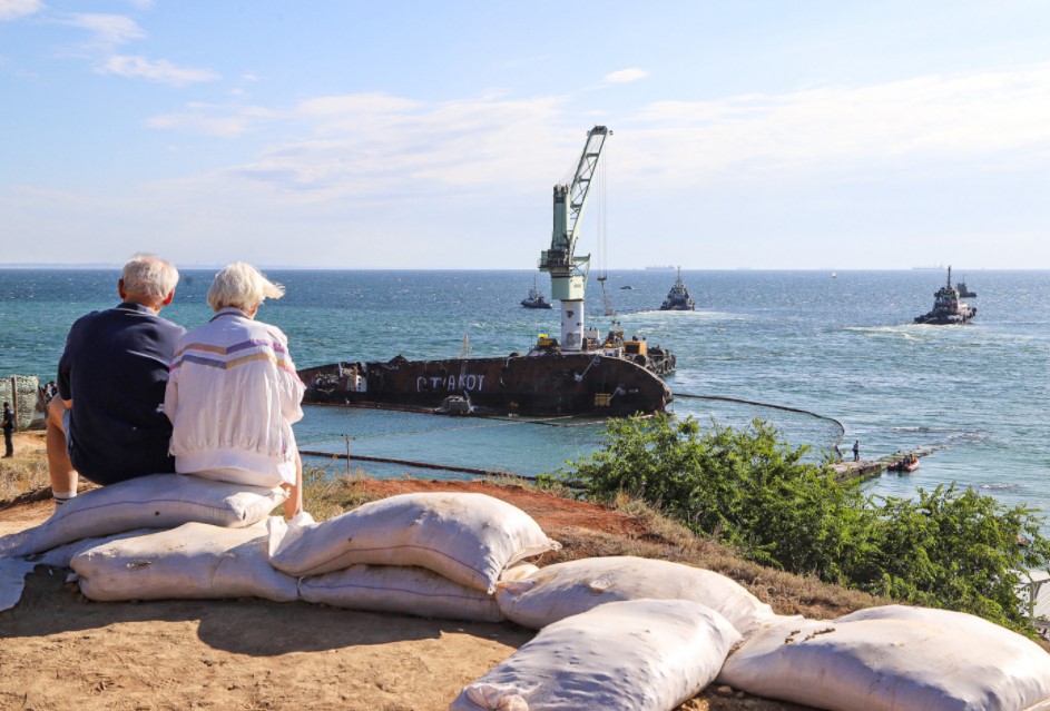 "В течение часа специалисты компании Краншип планируют откачать воду, наполнить воздухом танки правого борта и протестировать на прочность конструкции, которые приварили к корпусу для подъема. Сейчас четыре буксира пытаются поставить судно на ровный киль для дальнейшей транспортировки", - сообщил глава Одесской ОГА Максим Куцый.