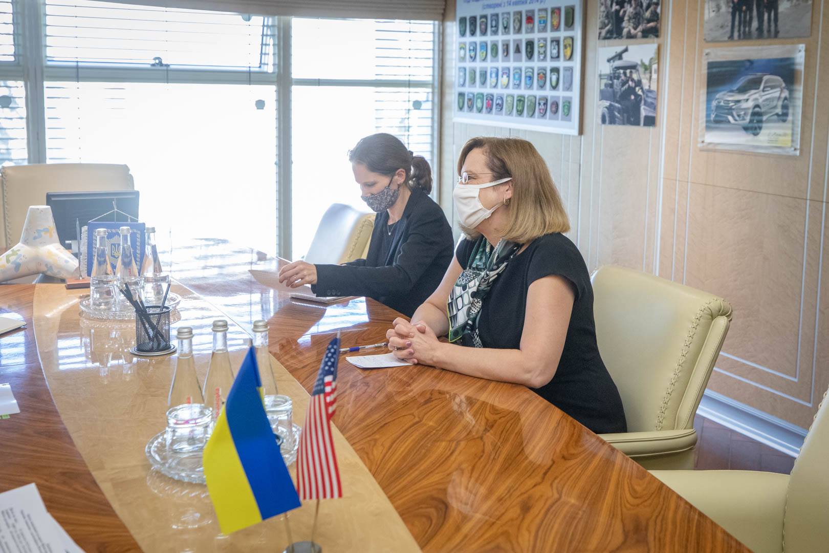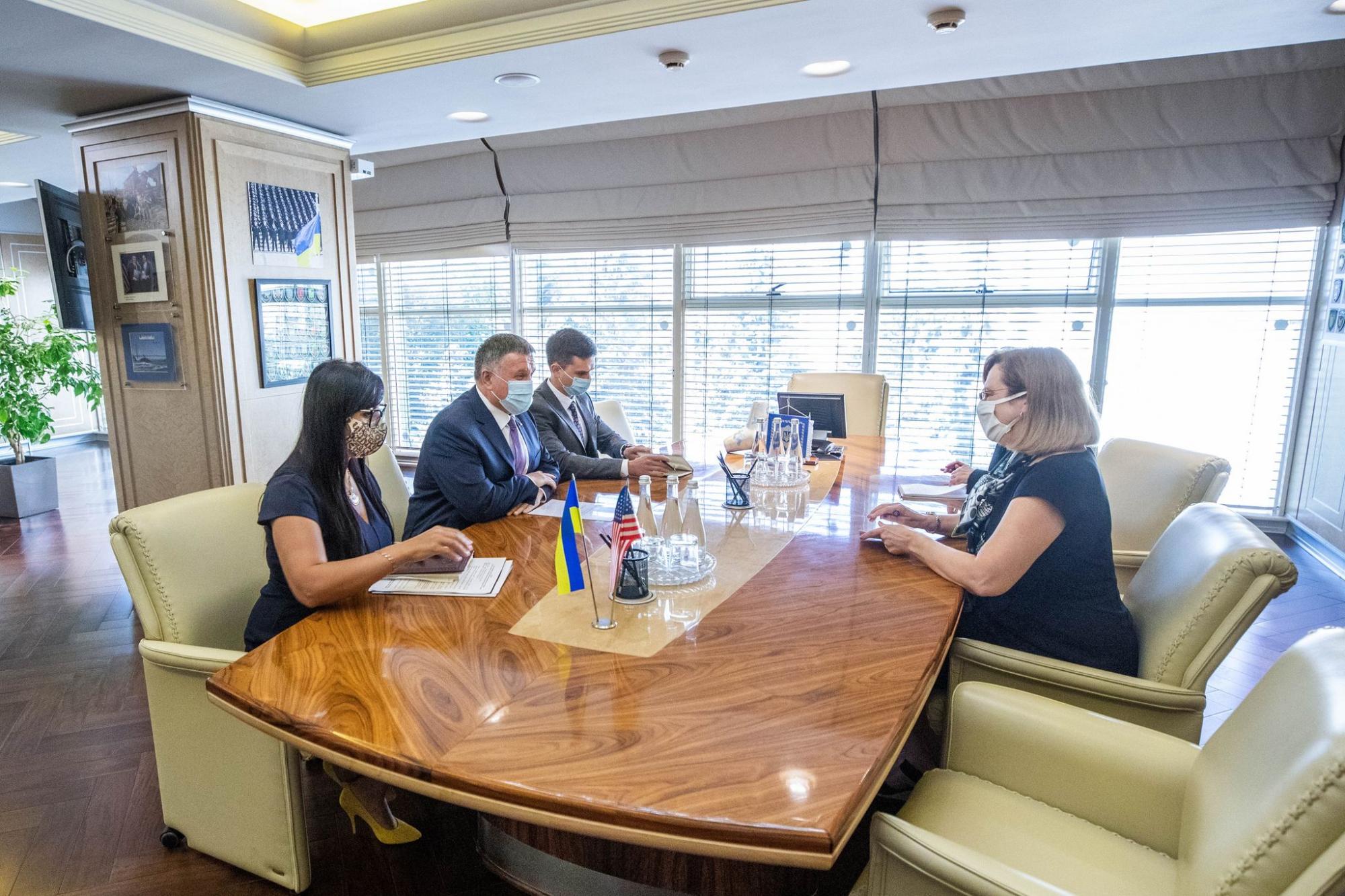 Министр внутренних дел Украины Арсен Аваков провел встречу с Временно поверенным в делах Соединенных Штатов Америки в Украине Кристиной Квиен и вновь назначенным руководительницей отдела по правоохранительным вопросам Посольства Сарой Лангенкемп.