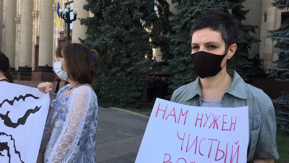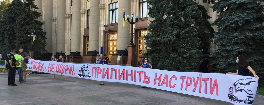 Как сообщает "Суспільне", в акции принимают участие 13 человек. Они держат плакаты "люди - не крысы! Прекратите нас травить", "Нам нужен чистый воздух".