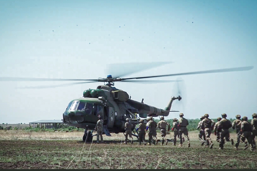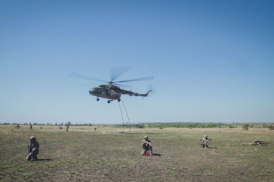 Бойцы удачно отработали действия при высадке штурмовых подразделений - десантирование происходило с вертолета Ми-8 с оружием и снаряжением.