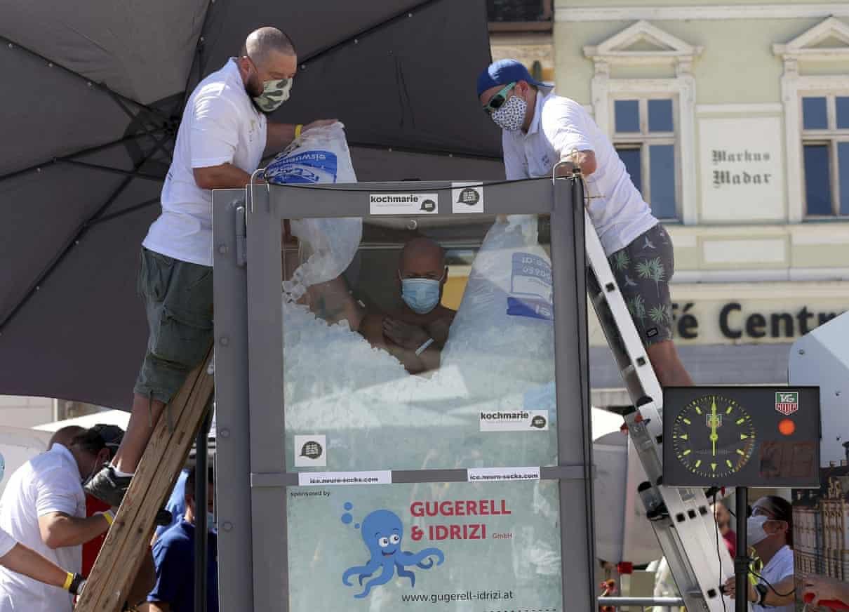 Австриец Йозеф Кеберл побил мировой рекорд, сумев в течение 2,5 часа продержаться в полной льда стеклянной кабине. Об этом сообщает ORF.