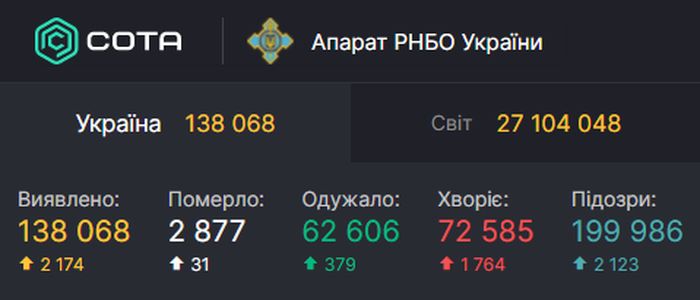 За прошедшие сутки в Украине выявили 2174 заболевших коронавирусной болезнью COVID-19 (днем ранее - 2107), умер 31 пациент (50), выздоровели 379 человек (578).