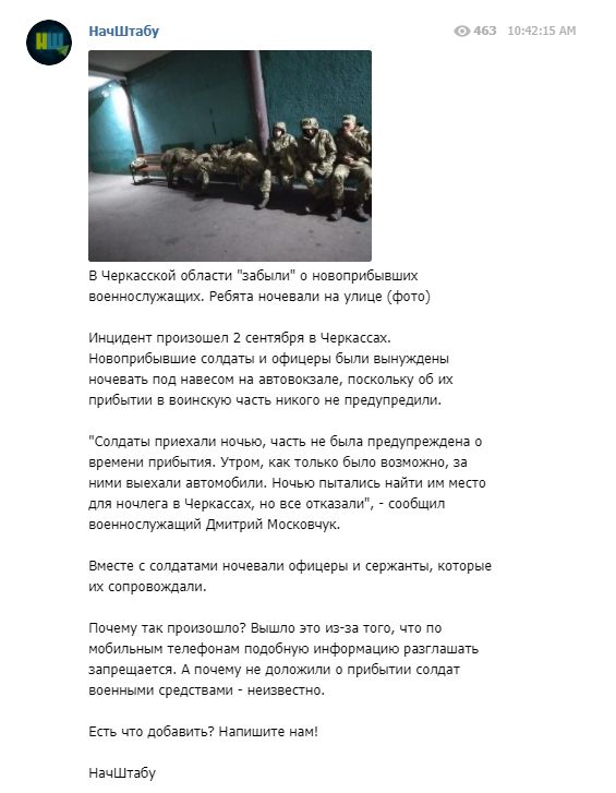 Инцидент, по данным паблика, произошел 2 сентября в Черкассах. Новоприбывшие солдаты и офицеры были вынуждены ночевать под навесом на автовокзале, поскольку об их прибытии в воинскую часть никого не предупредили.