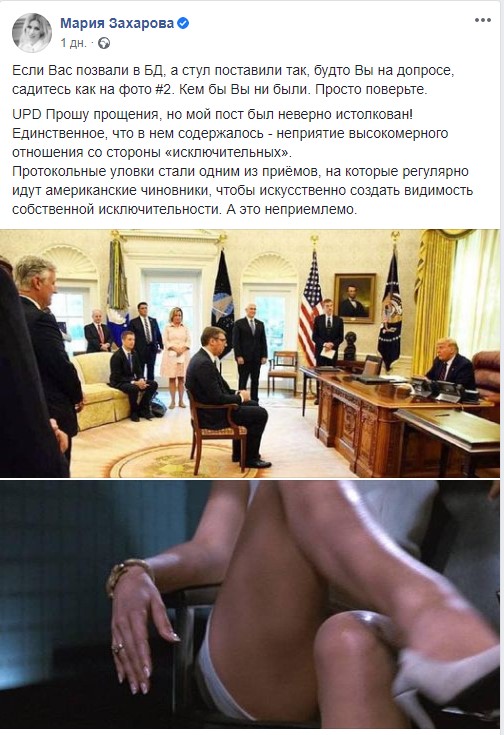 Ранее Захарова опубликовала пост в Facebook, в котором пошутила над фотографией сидящего напротив Дональда Трампа президента Сербии Александра Вучича. Она заявила, что в таких условиях надо садиться на стул, как героиня Шэрон Стоун из фильма «Основной инстинкт». Позже правительство Сербии выразило возмущение в связи с подобным сравнением.