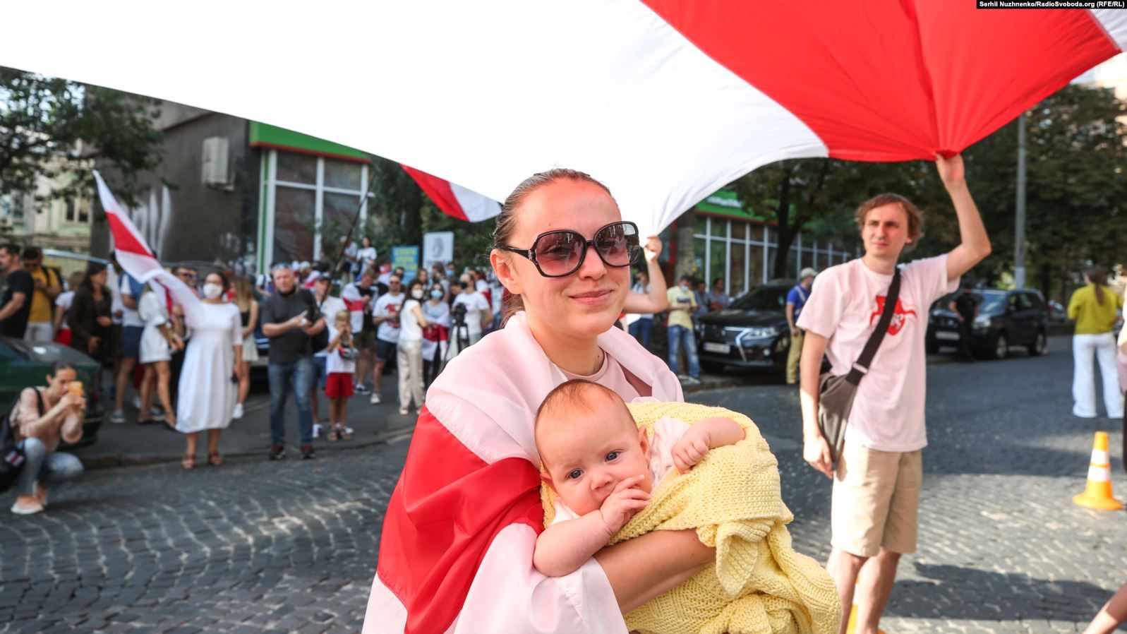 Участники развернули большой флаг бело-красно-белого цвета, который в Беларуси используют участники протестов, и прошли маршем по центральным улицам Киева к посольству Беларуси.