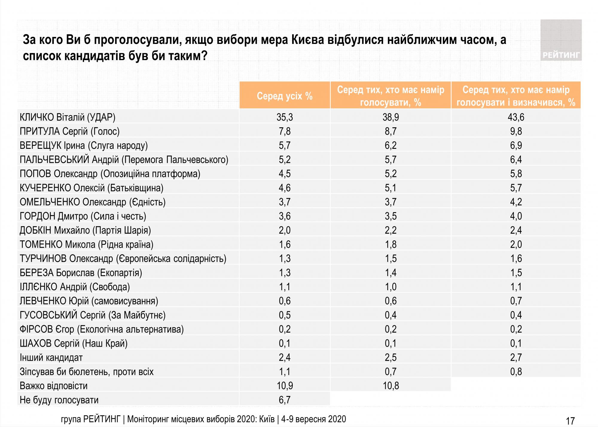 Если бы выборы киевского городского головы прошли в начале сентября, наибольшую поддержку избирателей получил бы Виталий Кличко. За действующего мэра готовы проголосовать 43,6% тех, кто готов принять участие в выборах и определился, за кого голосовать.