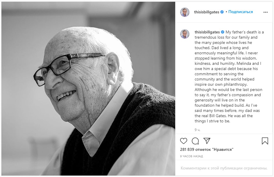 «Смерть моего отца — огромная потеря для нашей семьи и для многих людей, с жизнями которых он был связан. Папа прожил долгую и чрезвычайно насыщенную жизнь. Я никогда не переставал учиться его мудрости, доброте и скромности. Мы с Мелиндой в долгу перед ним, поскольку его стремление служить обществу помогло вдохновить нашу собственную благотворительность, — написал Билл Гейтс в инстаграме. — Как я уже говорил много раз, мой отец был настоящим Биллом Гейтсом. Он был всем, к чему я стремлюсь».