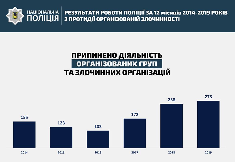 Игорь Клименко подчеркнул, что количество раскрытых организованных групп и преступных организаций ежегодно растет: «Если в 2014 году полиция пресекла деятельность 155 таких групп, то уже в 2019-м - 275, а за 8 месяцев этого года - 273. Почти на 40% увеличилось количество задокументированных этнических преступных групп и в 2,5 раза - группировок с межрегиональными связями. Только за 8 месяцев этого года под стражу отправлено почти 400 участников организованных групп и преступных организаций».
