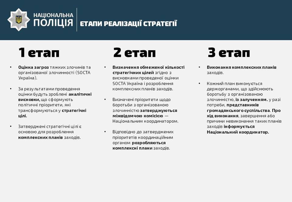 Ожидается, что Стратегия будет реализована в три этапа: оценка угроз по методологии SOCTA (это методика сбора и анализа информации о криминальной деятельности и группы, которые представляют угрозу для Украины и стран Евросоюза, определение стратегических целей и разработка комплексных планов мероприятий и комплексных планов мероприятий государственными органами, которые борются с организованной преступностью.