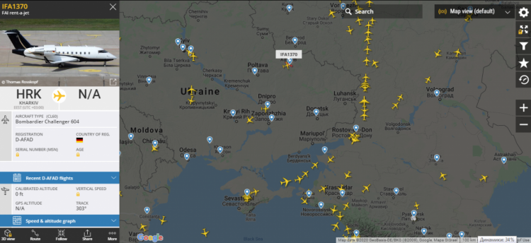 В 19:15 в Харьков из немецкого Нюрнберга прибыл самолет Bombardier Challenger 604 с бортовым номером D-AFAD, который принадлежит компании FAI Aviation Group. Эта компания в частности занимается медицинскими перевозками.