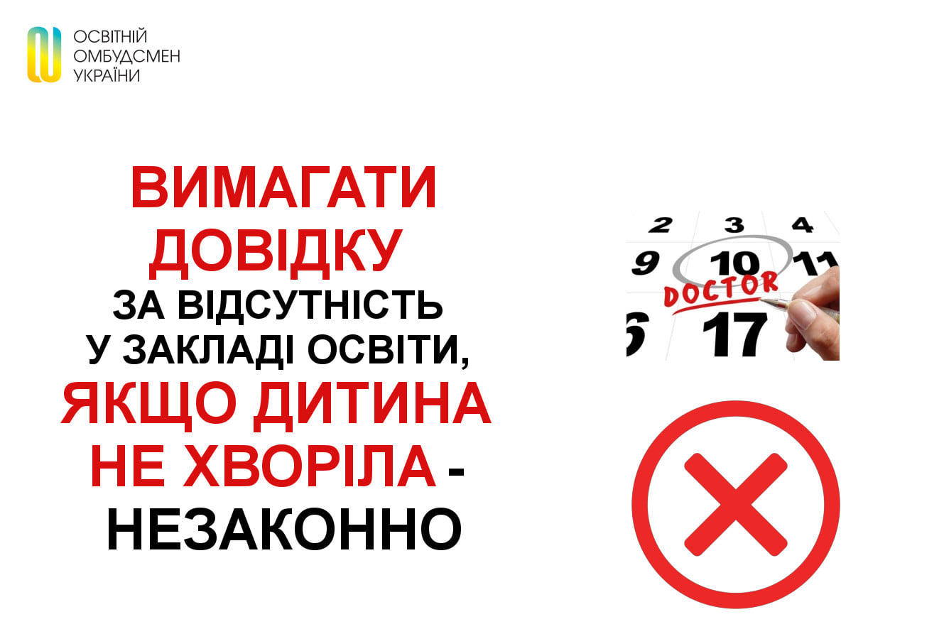 Із початком навчального року до освітнього омбудсмена почали звертатися батьки з проханням надати роз'яснення про те, чи правомірно, що в умовах пандемії коронавірусу адміністрація закладів освіти вимагає у них медичну довідку навіть у тих випадках, коли здорова дитина з певних причин не відвідувала дитсадок або школу один чи кілька днів, або прийшла до школи, пропустивши всього кілька уроків.