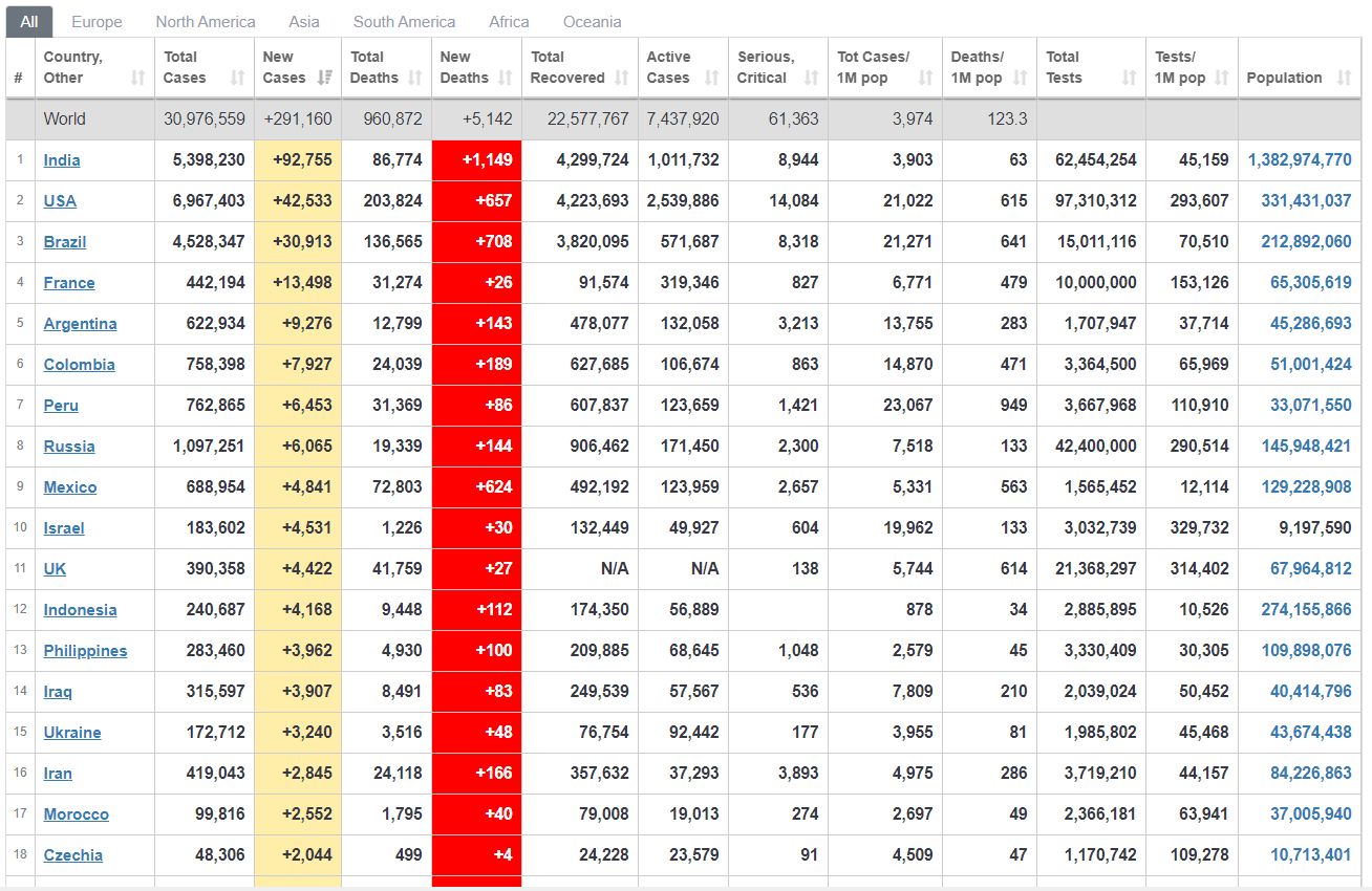 Среди 213 стран антилидерство по новым случаям имеют Индия (более 92,7 тысячи новых случаев), США (более 42,5 тысячи) и Бразилия (почти 31 тысяча), Франция (почти 13,5 тысяч).