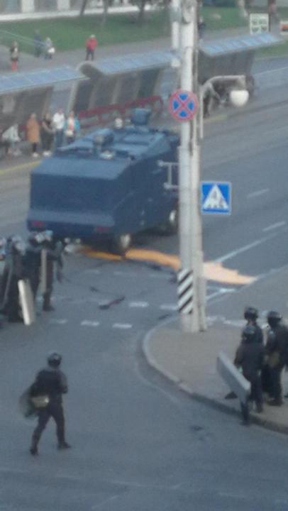Инцидент случился на перекрестке проспекта Независимости и улицы Козлова. Под водометом образовалась лужа из жидкости оранжевого цвета. Силовики пытались починить водомет. Через некоторое время его отогнали.