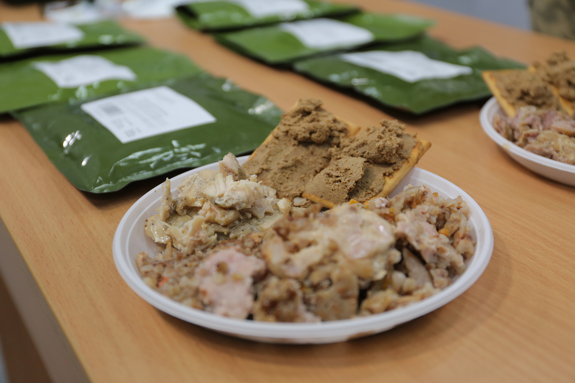 Сейчас представлены два из 24-х рационов, в которые входят 100 граммов мясной консервы, 60 граммов паштета, 280 граммов блюда (как пример - гречка с овощами и свининой), в которую включены 50 граммов мяса, галетное печенье, стик меда, кофе и чай. Каждого из этих рационов вполне достаточно для полноценного разового приема пищи военнослужащими в условиях выполнения заданий.