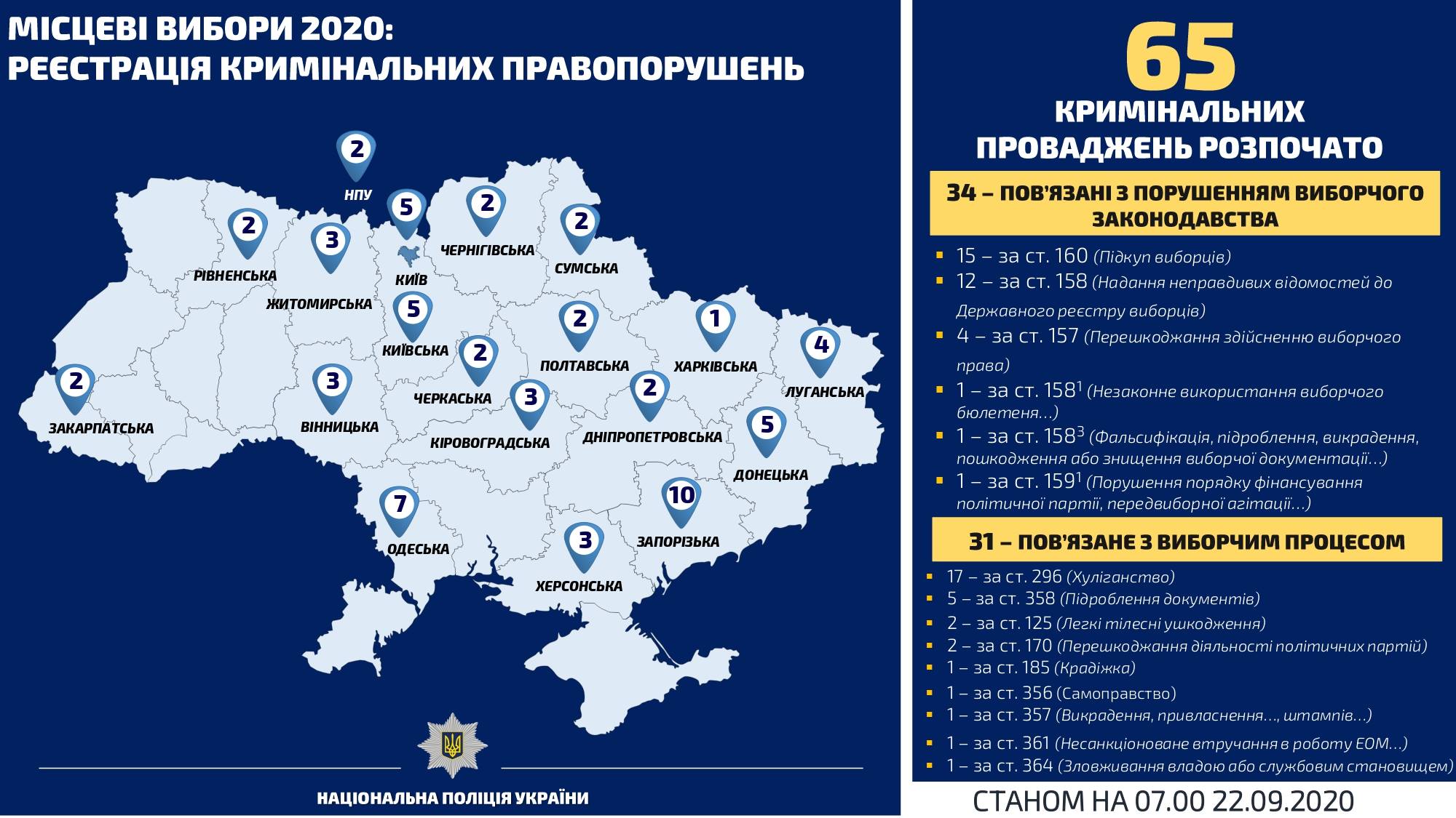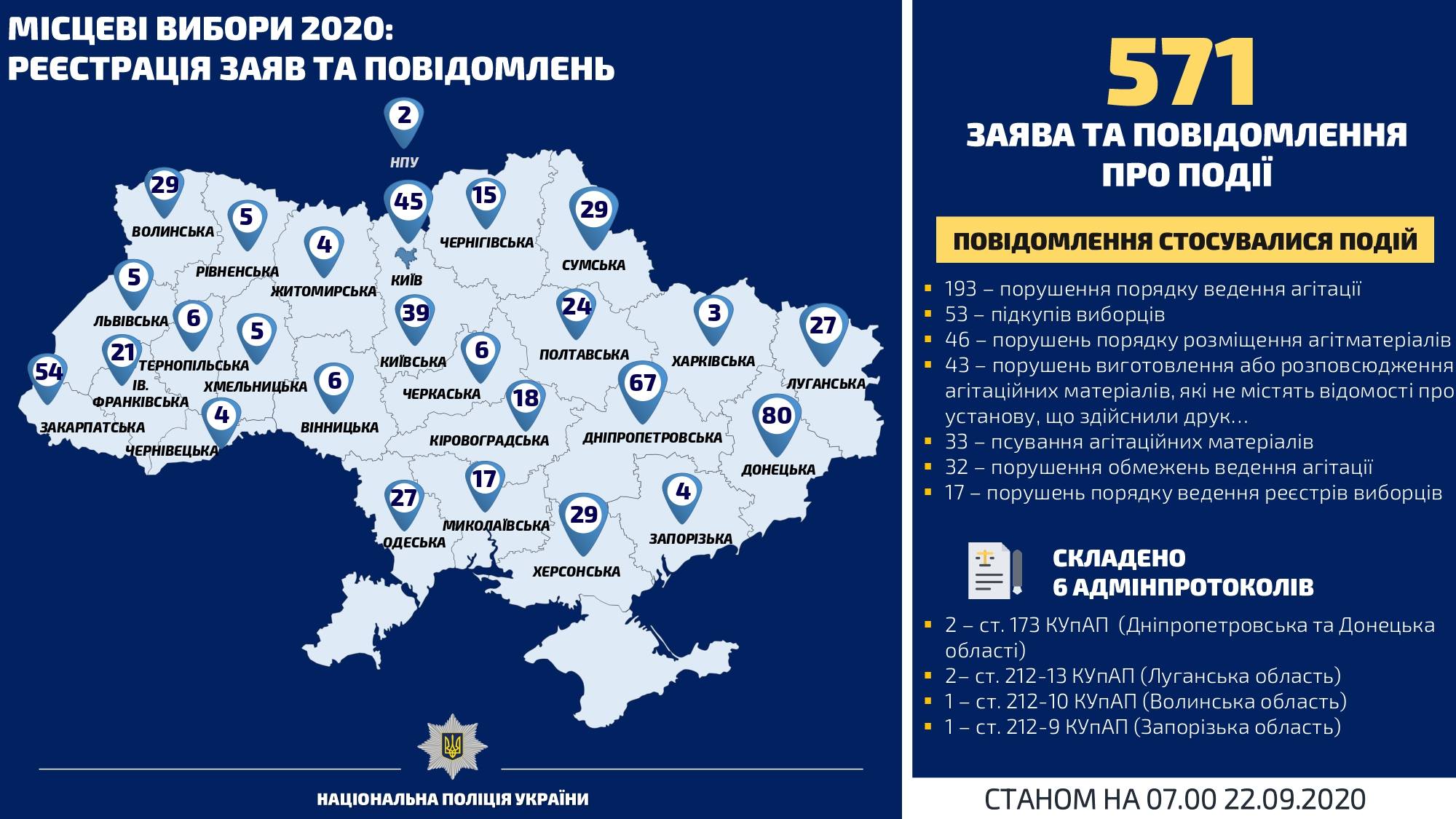 "Всего же с 5 сентября территориальные органы Национальной полиции зарегистрировали 571 сообщение, связанное с избирательным процессом", - отметили в полиции.