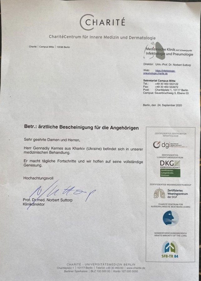 "Чтобы пресечь слухи и сплетни вокруг состояния здоровья Геннадия Кернеса, публикую медицинское заключение профессора клиники "Шарите". Перевод: "Уважаемые дамы и господа, Геннадий Кернес из Харькова (Украина) находится у нас на лечении. Он прогрессирует каждый день, и мы надеемся на его полное выздоровление. С уважением, профессор, директор клиники Норберт Сутторп", - написал Фукс, прикрепив фото заключения.