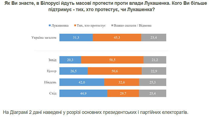 По результатам опроса, 45,3% всех украинцев поддерживают протестующих. Александра Лукашенко поддерживают 31,3% респондентов.