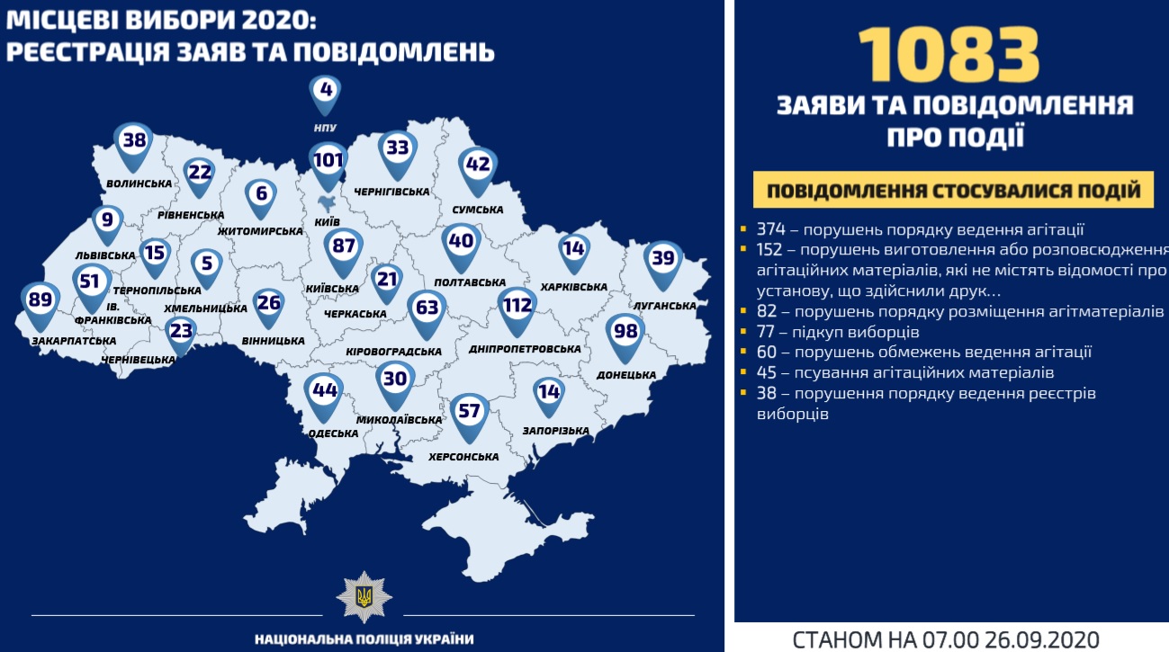 Всего с 5 сентября территориальные органы Нацполиции зарегистрировали 1083 заявления и сообщения, связанных с избирательным процессом.