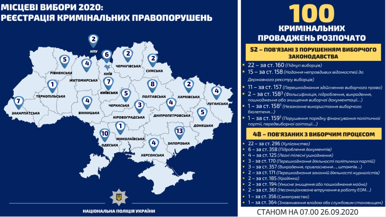За минувшие сутки (25 сентября) правоохранители открыли 15 уголовных дел по фактам нарушений избирательного процесса в рамках местных выборов.