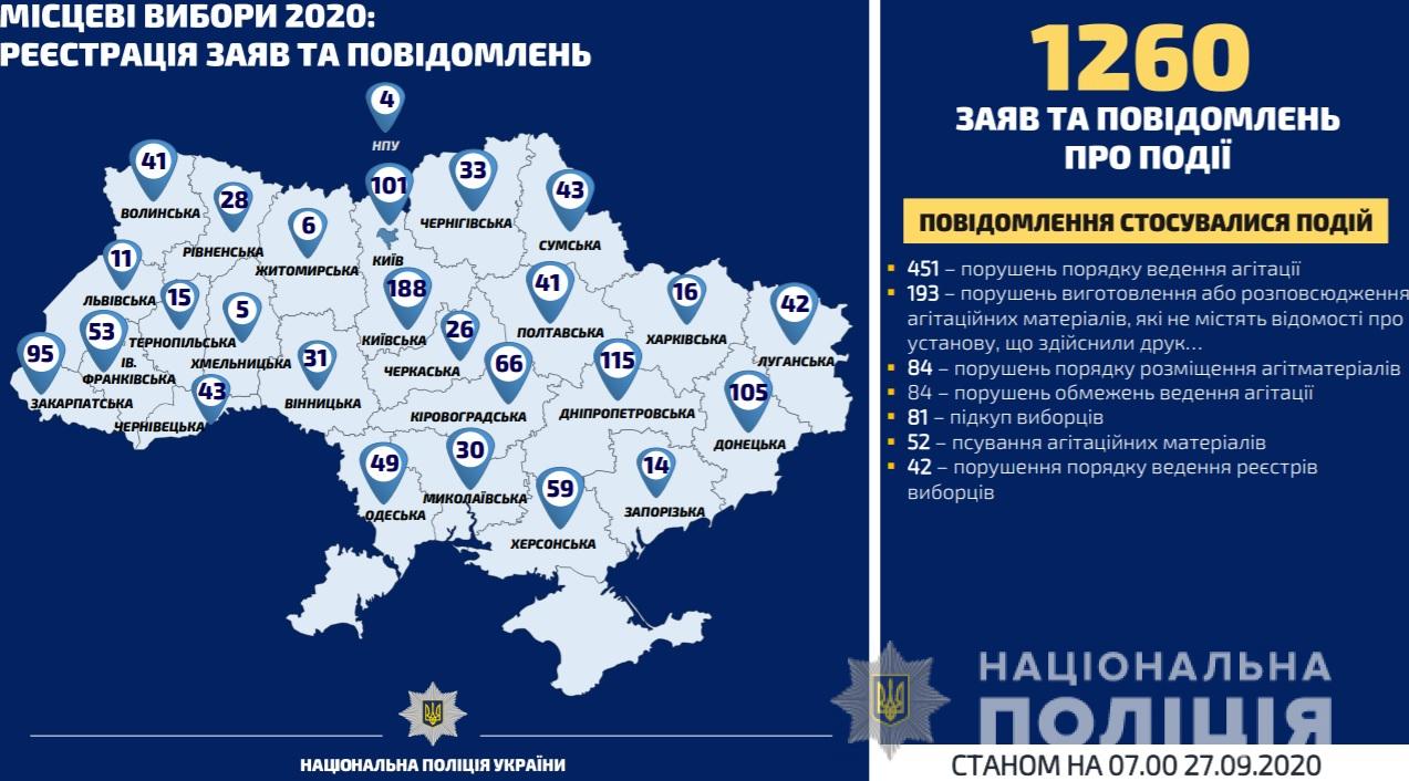 Усього ж із 5 вересня територіальні органи Національної поліції зареєстрували 1260 заяв та повідомлень, пов’язаних із виборчим процесом.