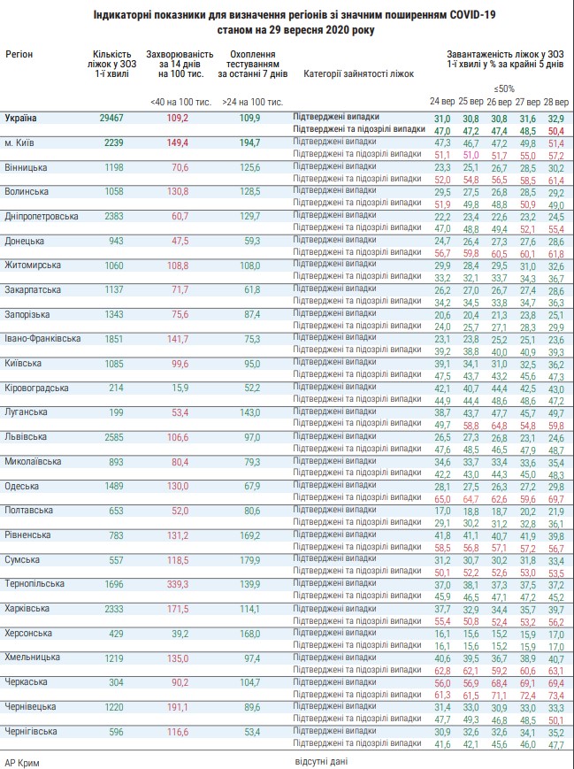 По состоянию на 29 сентября ситуация с распространением COVID-19 не позволяет ослаблять карантин в 22 областях Украины и в Киеве.
