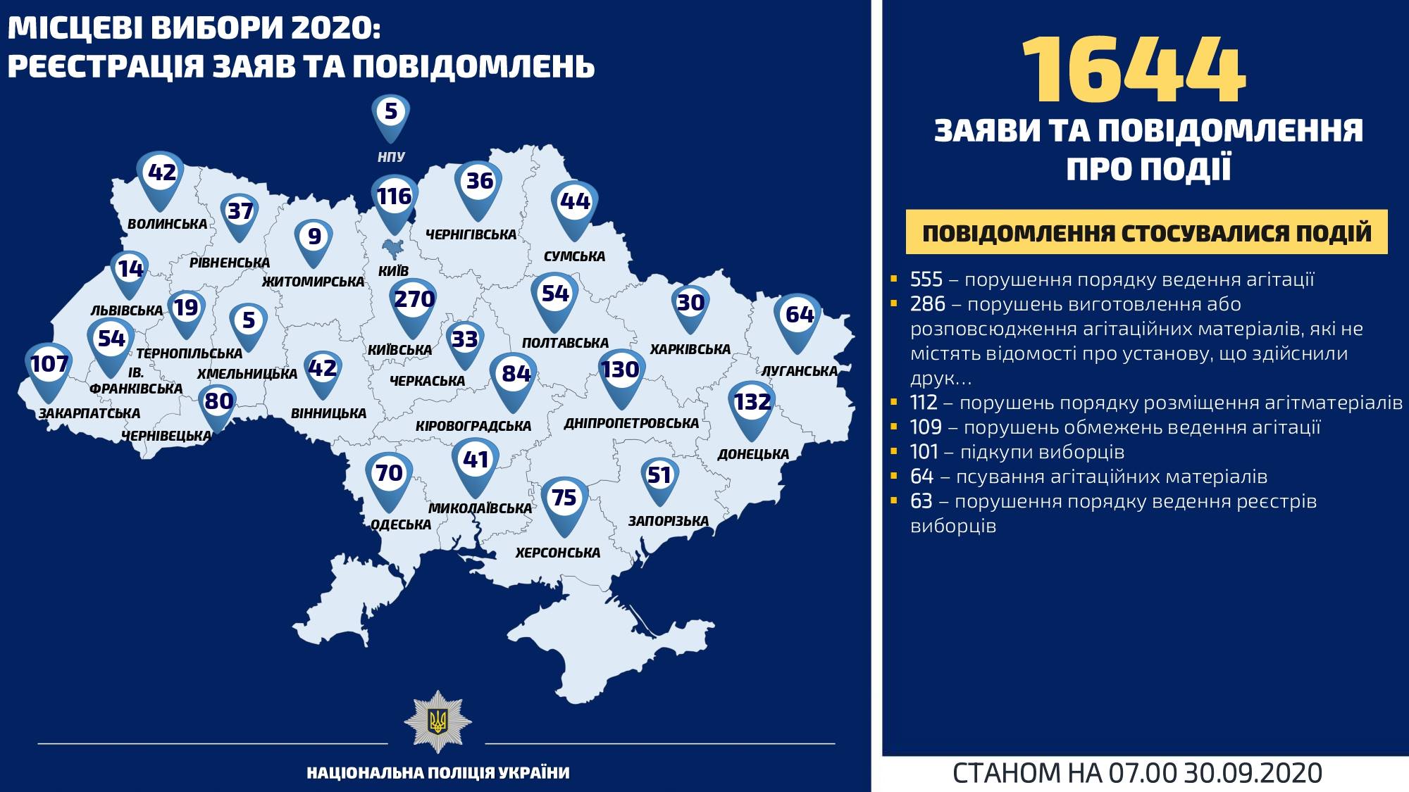 Усього ж із 5 вересня територіальні органи Національної поліції зареєстрували 1644 повідомлення, пов’язаних із виборчим процесом.